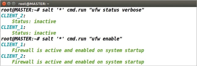 Let us look at another case where the administrator needs to enable the firewall in all the machines. This can be completed by executing a single command on the Salt Master as shown in Figure 7. The responses from all the client machines can also be seen in Figure 7.