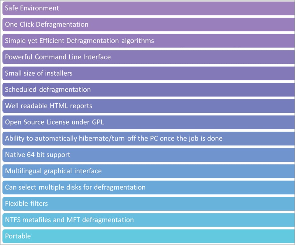 UltraDefrag is an open source disk defragmenter for Windows. It improves defragmentation and speeds up computer performance to read continuous data from the disk. It uses many defragmentation algorithms to do so.