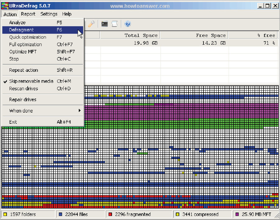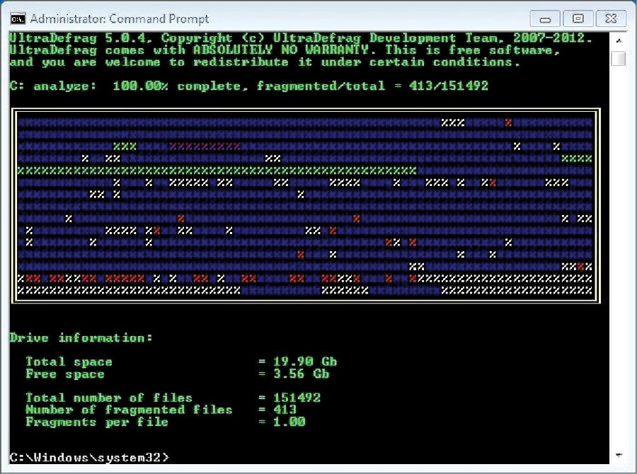 UltraDefrag gathers the complete information about files and gaps of free space by analysing the disk. Optimising or defragging the disk depends on the selected action or algorithm.
