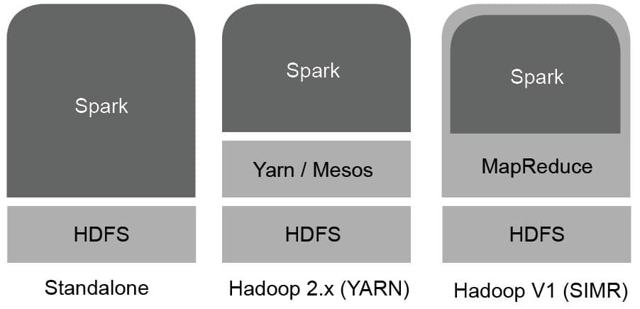 Spark can be deployed in three popular ways to cater to different scenarios. The first way is to use a standalone mode. Here, Spark is placed above HDFS and allocates memory to it manually. All Spark jobs on the clusters are executed with Spark and MapReduce running simultaneously. The second way is to use a cluster management system such as Hadoop YARN (Yet Another Resource Manager), which doesn’t require any pre-installation or root access to integrate with the Hadoop stack or ecosystem. Other components can be externally added on top to increase the functionality. The third way is to use SIMR (Spark in MapReduce) which, in addition to a manager, also executes a Spark job. Spark shell can be used without any administrative authorisation.