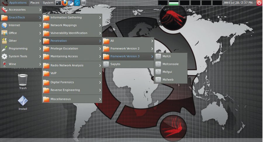 GnackTrack is an Ubuntu based penetration testing Linux distribution which includes lots of utilities for penetration testing. It has a GUI based GNOME desktop for easy interfacing. GnackTrack is an open source and free project, and contains various significant penetration testing tools like Metaspoilt, Armitage, wa3f and many more.
