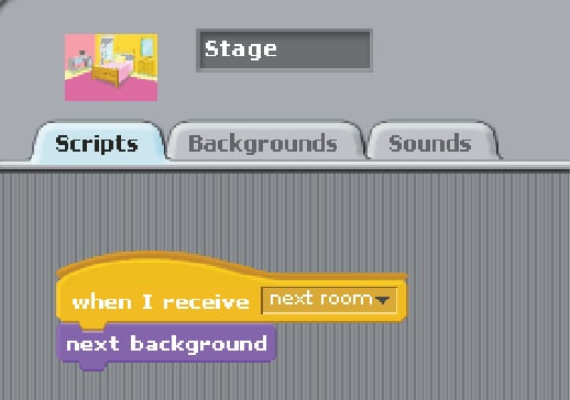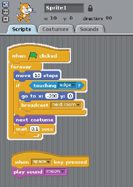 The example shown in Figures 2, 3 and 4 uses the default sprite with two costumes and a sound. Add three backgrounds to the stage. In the example, the sprite alternates between costumes and moves forward, giving the illusion of walking. Once it hits the end of the stage, it goes to the other end and sends a message to change the background. The sound is triggered by pressing the space bar.