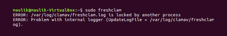 Figure 3 indicates an error while updating the virus database. This is because after the installation of the ClamAV daemon, the freeclam process is already running; so we need to stop it or kill it before running the command again.
