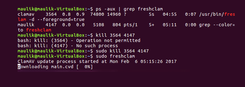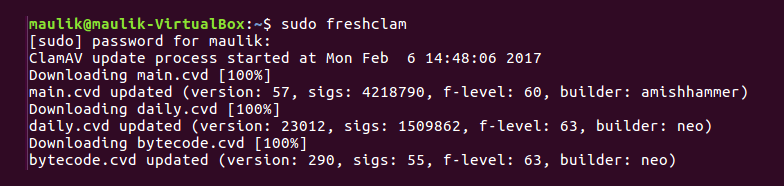 Now ClamAV is installed in our system. The next step is to update the virus definition database. This process is similar to normal updates done when instructing any antivirus software to fetch the latest virus related information. Once we run the command given below, two files — main.cvd and daily.cvd –will be downloaded and the virus database will be updated.