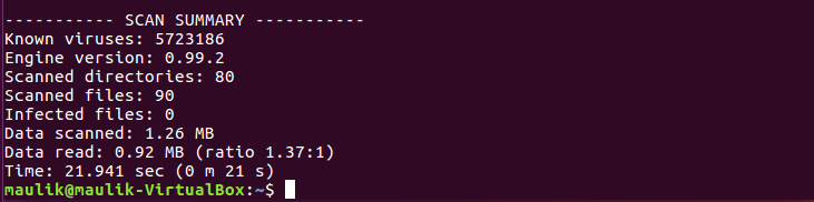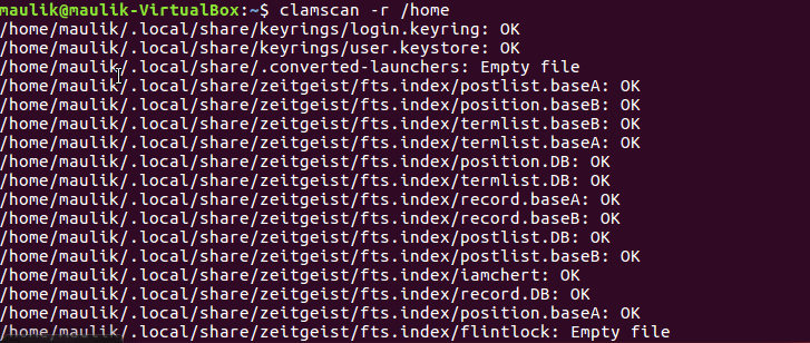Now we will scan the /home directory using ClamAV. Run the command given below to perform the scanning: