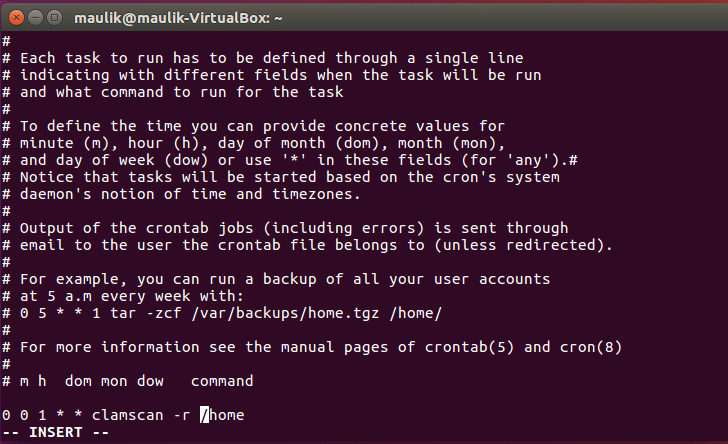 Minute Hour Day of Month Month Day of Week Command (0-59) (0-23) (1-31) (1-12 or Jan-Dec) (0-6 or Sun-Sat) 0 0 1 * * clamscan -r /home