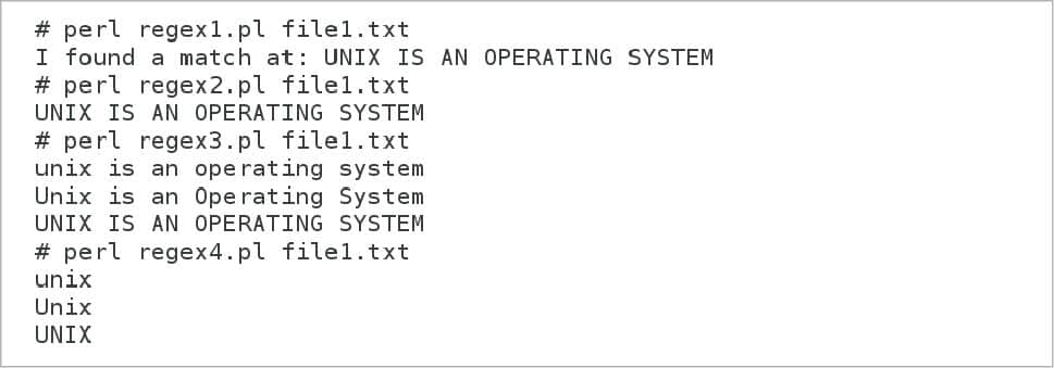 Changes are made in the fourth and fifth lines of the script regex3.pl. In the fourth line of code if(/UNIX/i) has been made if(/(UNIX)/i). Here, parentheses are used for capturing matched strings in Perl. In the fifth line of code, we are printing $1. Now, what is $1? The special variable $1 holds the instance of a regular expression match. Figure 3 shows the output while processing file1.txt using the Perl scripts regex1.pl, regex2.pI, regex3.pl and regex4.pl.