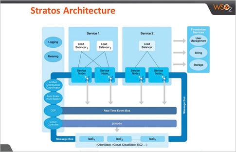 WSO2 architecture explained: WSO2 or Stratos architecture has multiple components to it. As mentioned earlier, along with logging and metering, it has many services components that contain load balancers (which are nothing but service nodes).