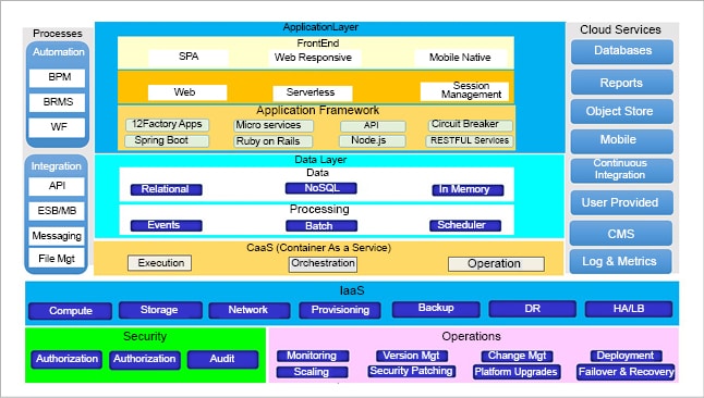 Application framework: This provides various platform runtimes for cloud native applications to execute, as well as visual assembly capability to assemble an application on the cloud.