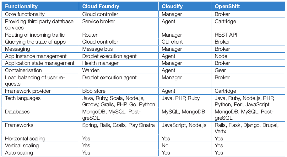 Table 1 shows the basic functionalities of the Cloud Foundry, Cloudify and OpenShift architectural components. This is purely based on our views and the authenticity of the features should ideally be revalidated by the cloud provider.