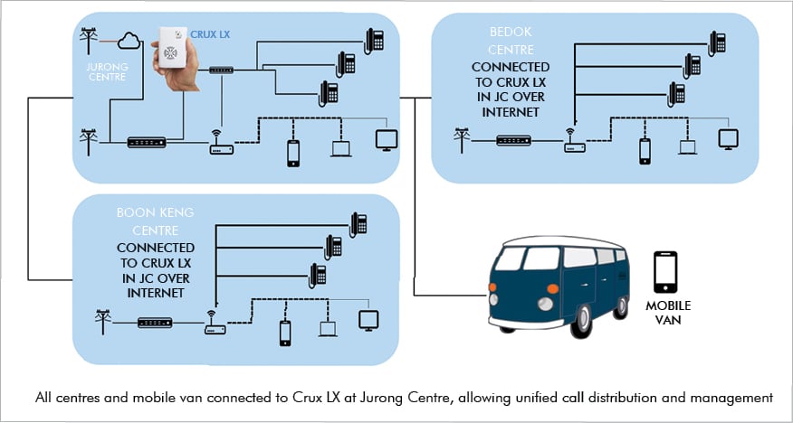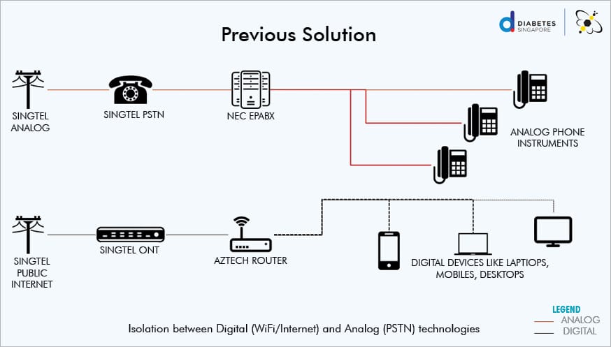 Like most health organisations, the telephony setup of Diabetes Singapore (DS) included a mix of PSTN lines (eight phone numbers), one mobile number across three branches and one mobile van. As individually numbered phone lines were difficult to advertise and remember, managing this telephony infrastructure was a challenge at times. Customers would often get confused between multiple lines and locations. For Internet access, Narasiah’s team was using isolated digital public Internet lines, which were distributed by a router to the team members’ different devices in their branch offices. There was no voicemail or auto attendant/IVR (Interactive Voice Response) system for support. Calls between branches required placing external calls.