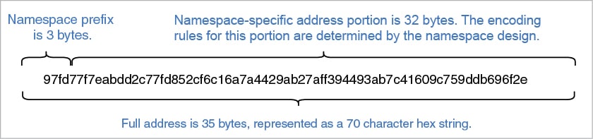 The tree is an addressable Radix tree, because addresses uniquely identify the paths to leaf nodes in the tree where information is stored. An address is a hex-encoded 70-character string representing 35 bytes. In the tree implementation, each byte is a Radix path segment, which identifies the next node in the path to the leaf containing the data associated with the address. The address format contains a 3-byte (6-hex character) name space prefix, which provides 224 (16,777,216) possible name spaces in a given instance of Sawtooth. The remaining 32 bytes (64 hex characters) are encoded based on the specifications of the designer of the name space, and may include schemes for sub-dividing further, distinguishing object types, and mapping domain-specific unique identifiers into portions of the address.