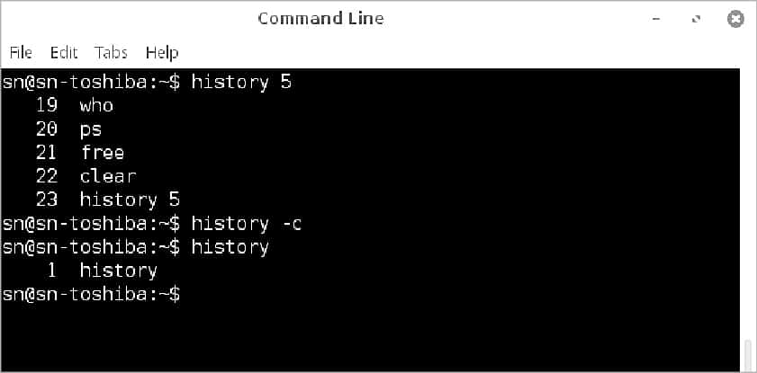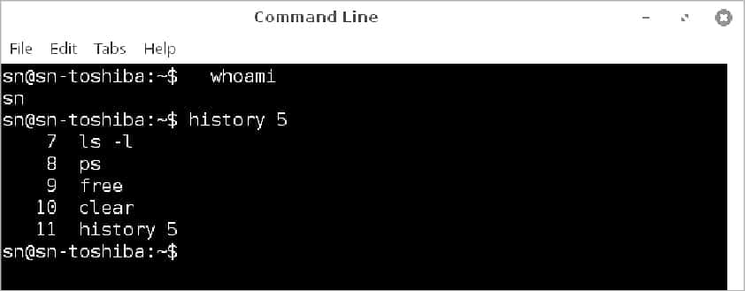Notice that the ‘whoami’ command with the space inserted before it is not displayed by the History command. The number, 5, after the History command is the option given, which indicates the number of the previous commands to be displayed.