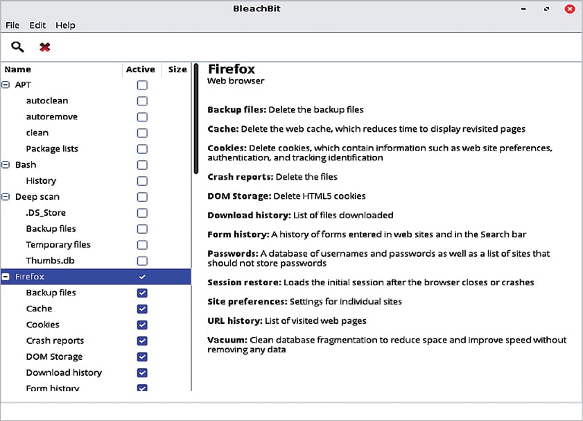 Bleachbit can be used to clean up the junk files and folders of commonly used applications, delete temporary files and free up space. It also clears the browser cache, the list of downloaded files and even the commands in the History file. In addition, it can be used to shred files and folders so that they cannot be recovered and wipe the free disk space.