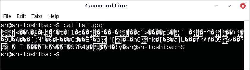 The encrypted file can then be decrypted by running the command gpg2 with the name of the encrypted file as the parameter. The passphrase must be entered, following which the command will produce the decrypted file which is the same, but with the .gpg extension removed from the file name.