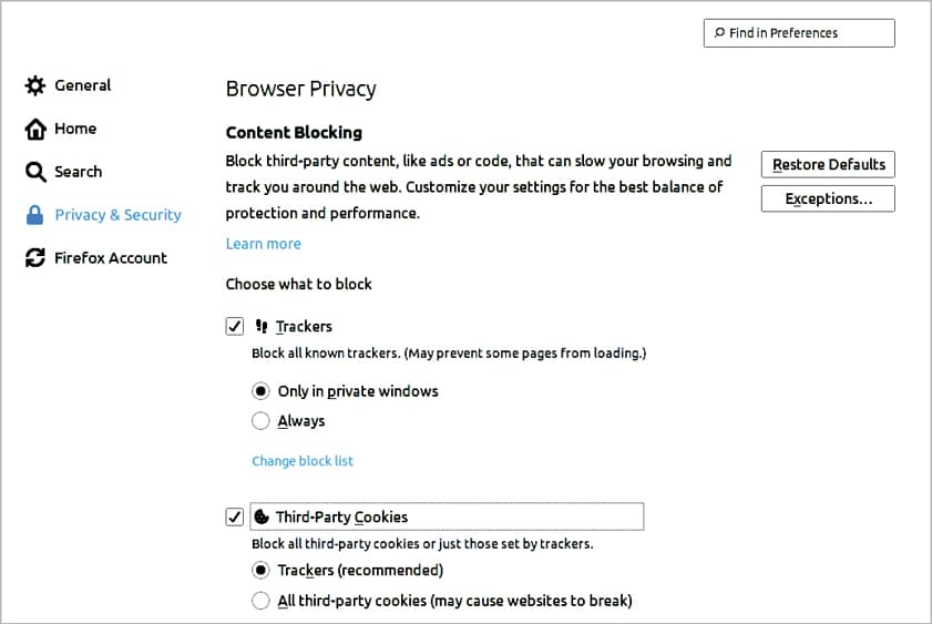 Select the tracking protection you want. If you opt for it to be always on, it may affect the functioning of some regularly visited websites. To avoid these problems, you can choose to block the third-party cookies only.