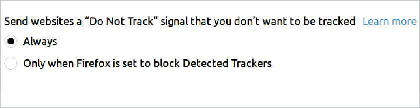The ‘Do not track’ option: Chrome and Firefox have the Do not track option in the browser settings, which can be turned on to prevent the websites from collecting the browsing information. But this is not sufficient as most of the websites do not honour the request since they face no penalty for not doing so.
