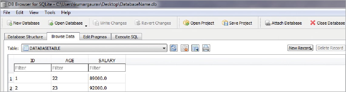 import sqlite3 sqliteconnection = sqlite3.connect(‘DatabaseName.db’) sqliteconnection.execute(“INSERT INTO DATABASETABLE (ID, AGE, SALARY) \ VALUES (1, 22, 89000)”); sqliteconnection.execute(“INSERT INTO DATABASETABLE (ID, AGE, SALARY) \ VALUES (2, 23, 92000)”); sqliteconnection.commit() print (“Records Inserted”); sqliteconnection.close()
