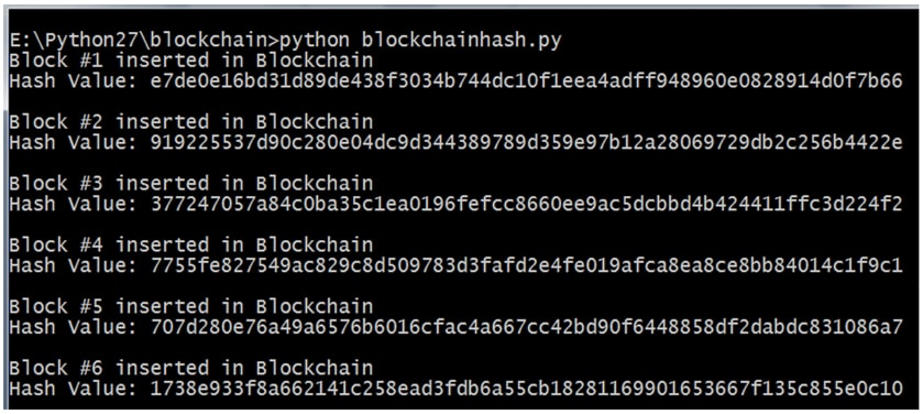 With the execution of the code, the outcome shown in Figure 2 is obtained with different hash values, and it provides a higher degree of security using cryptography functions. Using these hash values, hacking or sniffing the transaction is almost impossible.