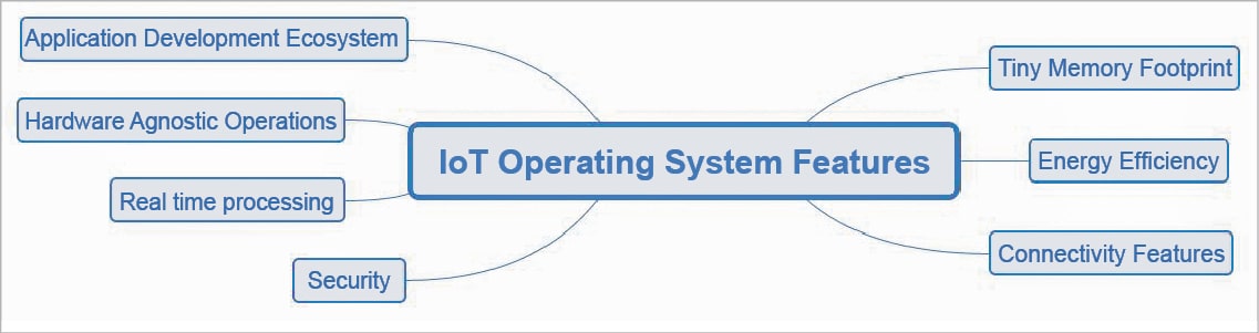 As the application domains become diverse, the need to manage the IoT infrastructure efficiently is also becoming more important. The operating systems in normal computers perform the primary functions such as resource management, user interaction, etc. The requirements of IoT operating systems are specialised due to the nature and size of the devices involved in the process. Some of the important characteristics/requirements of IoT operating systems are listed below (Figure 2):