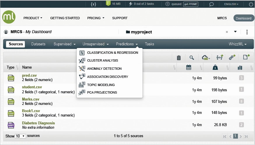 The BigML dashboard has access to different data sets and algorithms under supervised and unsupervised taxonomy, as shown in Figure 4. The researcher can use the algorithm from the menu according to the requirements of the research domain.