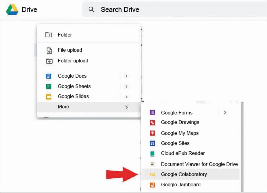 Google Colaboratory is available as a Google app in Google Cloud Services. It can be invoked from Google Drive as depicted in Figure 6 or directly at https://colab.research.google.com.