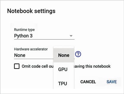 The Jupyter notebook in Google Colaboratory is associated with the CPU, by default. If a hardware accelerator is required, like the tensor processing unit (TPU) or the graphics processing unit (GPU), it can be activated from Notebook Settings, as shown in Figure 7.