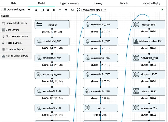 It has a visual editor so that the multiple layers of different types can be programmed. The layers that can be imported are core layers, hidden layers, convolutional layers, recurrent layers, pooling layers and many others.