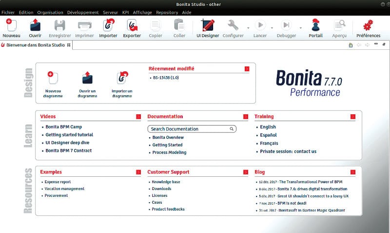 Bonita Studio CE is a complete free software solution for business process management and workflow, written in Java and licensed under the GNU General Public License v2. Bonita is available in both 32-bit and 64-bit versions for GNU/Linux, Windows; and in a 64-bit version for Mac platforms. It is the community edition that is libre and free for download. Users can graphically modify business processes using the BPMN standard, and connect the processes to other pieces of the information system to generate autonomous business applications accessible via Web portals, Web forms and mobile devices. Bonita Studio also allows the user to start with processes designed with other standards and technologies such as XPDL or jBPM. It is part of the Bonita application platform with several other components – Bonita BPM Engine, Bonita Portal, Bonita UI Designer and Bonita Continuous Delivery. The latest version of Bonita Studio CE is Bonita 7.8.1 and can be downloaded from https://www.bonitasoft.com/downloads.
