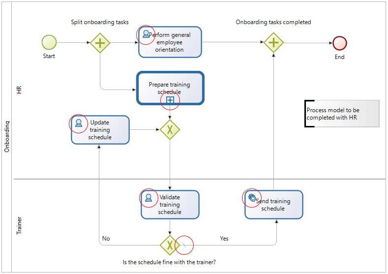 Human activity is a step that must be done by a person, while service activity is an automated step. Call activity represents a sub-process, e.g.,‘Preparing training schedule’is a call activity linked to a sub-process which is a ‘child’ of the original parent process. At this point in the process, a token is passed to the sub-process and when it has completed, it is passed back to the parent process. Using this notation, you can model a top-level parent process that can be quite simple. It can call a series of sub-processes that are entirely independent workflows. This means they can be modelled independently and modified as needed without necessarily changing the parent process.