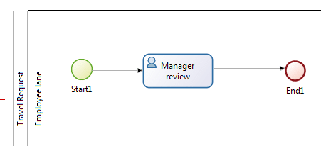 8. Later on in this process, the subsequent task would be to send the travel request details to the admin team so that they can handle the booking. For now though, we are just interested in getting the first part of the process working; so add an end after the review task. You can do this by dragging the end icon (red circle) from the palette to the whiteboard, and then connecting to the Manager review task with a flow element.