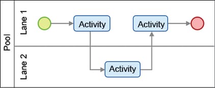 Organising uses pools and swimlanes. Pools contain a single, complete process and the workflow cannot leave a pool. Swimlanes are used to help organise the process based on who does what (actors). In a lap pool, swimlanes keep the swimmers from crashing into one another, but the workflow crosses swimlane boundaries as if they did not exist and are only for organisational clarity.