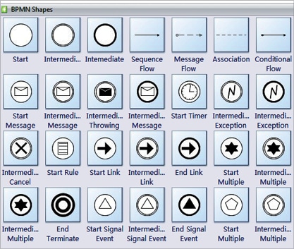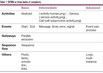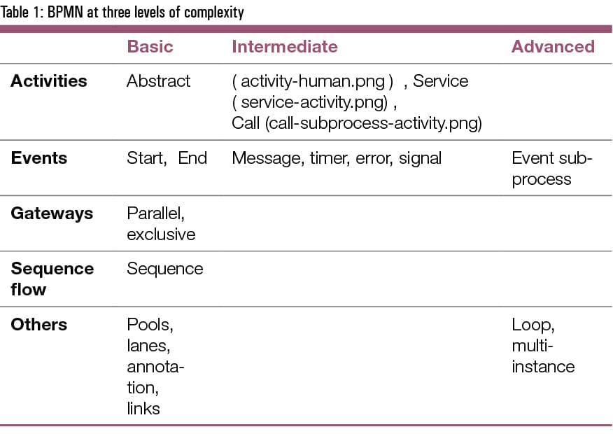 BPMN symbols can be defined at three levels of complexity – basic, intermediate and advanced. While basic is predominantly visual, intermediate and advanced BPMN becomes executable. BPMN symbols serve a dual purpose. Primarily, they visually represent a process flow and secondarily, they translate to executable code that allows a visual process model to be executed as an application.