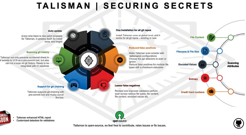 Talisman hooks into a Git repository to validate the outgoing change set for things that look suspicious, like potential SSH keys, authorisation tokens, private keys, etc. It can scan the source code to catch potential problems in embedded source code and documentation. This tool can help prevent major disasters related to security.
