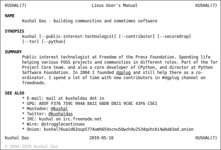 Kushal Das describes himself in a brief online ‘Linux User’s Manual’ thus: “Public interest technologist at Freedom of the Press Foundation. Spends life helping various FOSS projects and communities in different roles. Part of the Tor Project Core team, a core developer of CPython, and director at Python Software Foundation. In 2004, I founded dgplug and still help there as a co-ordinator. I spend a lot of time with new contributors in #dgplug channel on freednode.”