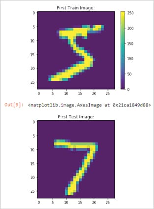 import keras from keras.datasets import mnist from keras import models, layers import numpy as np import matplotlib.pyplot as plt from keras.utils import to_categorical # Reading the mnist dataset which is 28X28 pixel of 70k integer (0-9) RBG scale images # Out of these 70K, I am using 60K to train my deep network, rest 10k will be used for validation/testing (train_images, train_labels), (test_images, test_labels) = mnist.load_data() print (train_images.shape); print (train_labels.shape); print (train_labels); # Lets see the images visually using MatPlot plt.figure() plt.title(‘First Train Image:’); plt.imshow(train_images[0]); plt.colorbar() plt.grid(False) plt.show(); plt.title(‘First Test Image:’); plt.imshow(test_images[0])