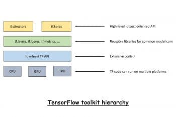 TensorFlow APIs are arranged hierarchically. The high-level API is object-oriented and called tf.keras. It is another API variant of the FOSS tool Keras, and can be used to train machine learning models to make predictions. The TensorFlow toolkit also contains reusable libraries that can be used for learning algorithms. The low-level API of TensorFlow is used by many machine learning researchers to create and explore new ML algorithms. With the help of the toolkit, it is possible to create machine learning algorithms that can run on the CPU, GPU and TPU.