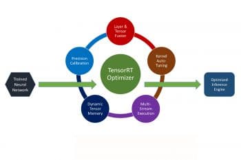 TensorRT has an optimiser that can do precision calibration, layer and tensor fusion, kernel auto-tuning, multi-stream execution and dynamic tensor memory handling. TensorRT optimises the trained neural network to get an optimised inference engine, and makes it possible to train AI machines efficiently.