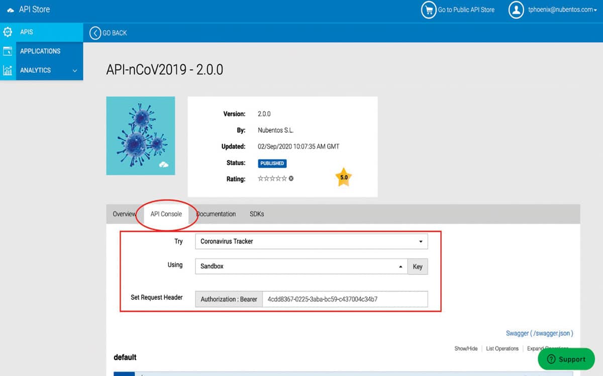 The coronavirus_tracker app uses free of cost API-nCov2019 v2.0.0 to get the Covid-19 data, which is shown in Figure 5. This API is provided by Nubentos S.L, an API marketplace for the digital healthcare sector. To use its services, visit the API Store and select API-nCov2019-2.0.0 [https://store.nubentos.com/store/apis/info?name=API-nCoV2019&version=2.0.0&provider=admin]. Register and log in to use the services.