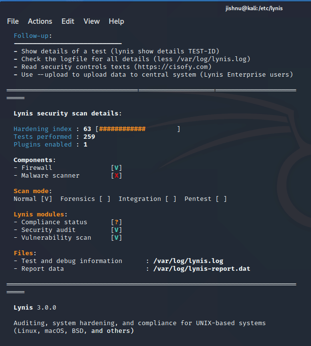 With this instruction, Lynis performs all basic tests and gives us details like how many tests are included in this, as well as the hardening index of our operating system (as shown in Figure 1).