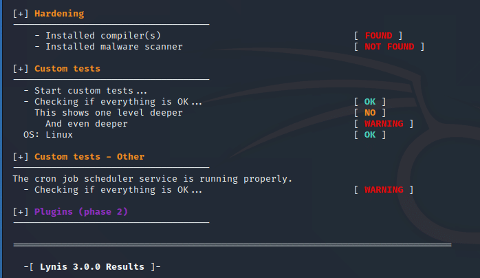 We then run the Lynis audit again using the command that we have already seen, lynis audit system –quick and get the output of the newly written test in the custom tests section (see Figure 3).