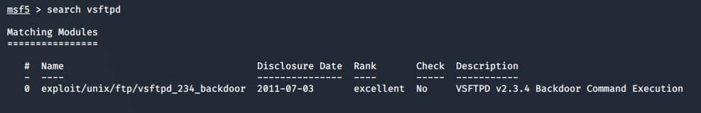 Now search the vsftpd exploits available in the Metasploitable framework, which could give us a backdoor entry to Metasploitable.