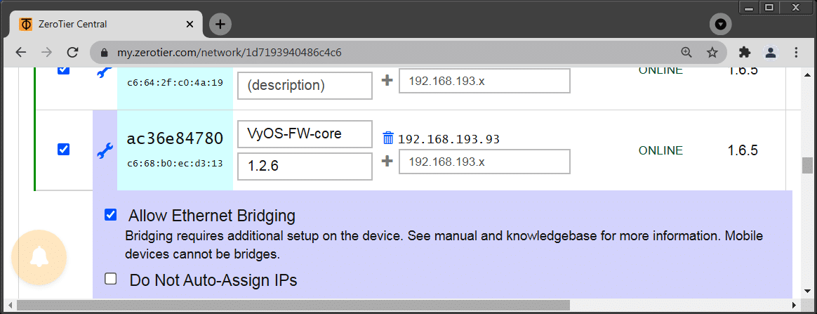 By default, clients do not operate as a network bridge. To enable bridge mode, go to the ZeroTier Web UI and enable ‘Allow Ethernet Bridging’ for each device individually (Figure 4).