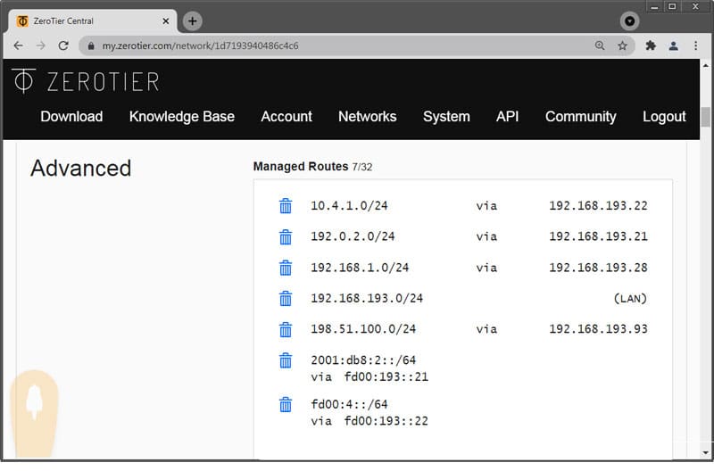 ZeroTier can not only connect individual clients, but also entire networks. The ZeroTier software then runs on a router that announces its connected IP networks to the other ZeroTier routers. The outcome resembles a multipoint VPN that connects all locations and is managed from a central location. The advantage of this solution is that it eliminates the manual configuration that is typical for OpenVPN and IPsec.