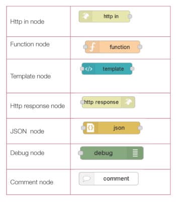 4) Connect template node to http response node; the latter sends responses back to requests received from an http input node.