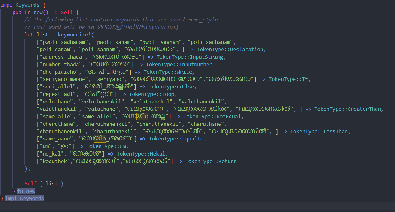 Malluscript has 31 different tokens, with some of the keywords having multiple aliases. When I was writing Malluscript initially, I only intended it to support Manglish (Malayalam language written using English words) since that is the most common way Malayalam speaking people communicate through the internet. But after the first release, I decided to incorporate actual Malayalam Unicodes too. Therefore, Malluscript’s keywords can have multiple aliases in both English as well as Malayalam keywords. I wrote a specialised function in the lexer to detect this as well. Figure 2 shows the keyword mapping in Malluscript.
