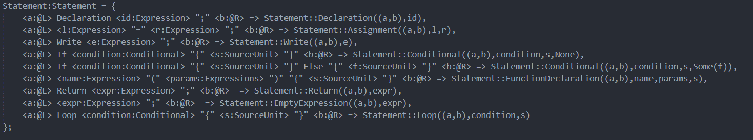 LALRPOP, as quoted by its author, is a Rust parser generator framework with usability as its primary goal. LALRPOP lets us write clean and readable context-free grammars, and we define how Malluscript’s code should be interpreted and how it should look. For example, consider the statement parser of Malluscript in LALRPOP shown in Figure 3. It closely resembles the context-free grammar we usually write for theoretical compiler design problems. On compilation (compilation of the interpreter), LALRPOP converts these CFG rules to Rust code. And using our parser, we parse our tokens generated in the previous step, and generate an abstract syntax tree (AST).