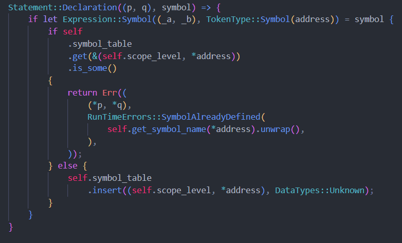 Now our lexer-converted tokens are built into an AST, which represents how the code should be executed. The job of our executor is to simply navigate through AST nodes and do the necessary operations mentioned by them. For example, Figure 4 shows executor code for a declaration statement in Malluscript.