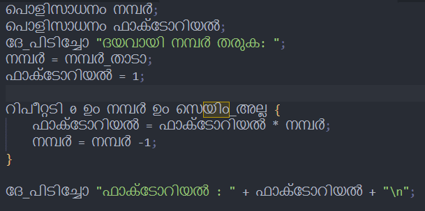 As people from the Indian state of Kerala primarily speak Malayalam, they are often referred to as ‘Mallus’ across India. Malluscript felt like an appropriate choice of name for a programming language for Mallus that enables them to write programs in Malayalam. One of the main aims of this language was to use it in an instant coding competition, in which students would be provided with a brand new language to solve certain problems in. Since the main objective was to attract younger students for a competition, I designed Malluscript in a comic tone, involving trendy memetic keywords as tokens.