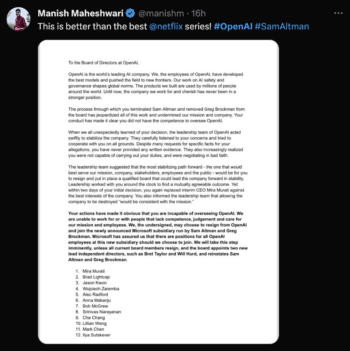 The drama deepened when over 700 OpenAI employees, taken aback by Altman’s abrupt dismissal, rallied in his support. The tweet “Open AI is nothing without its people” became trending and over 500 of the employees threatened to leave for Microsoft, challenging the board’s decision and showcasing a deep-seated loyalty to Altman. It was more than just a protest; it was a testament to Altman’s leadership and vision.